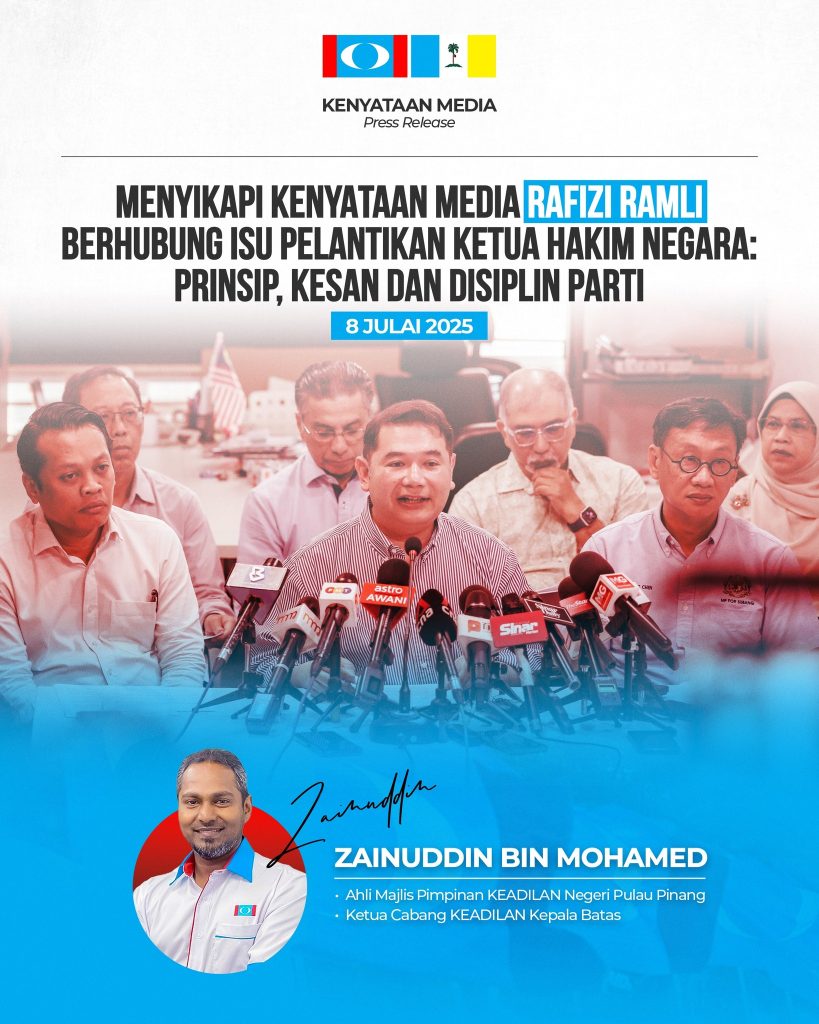 Saya mengambil maklum kenyataan media oleh YB Rafizi Ramli pada 7 Julai 2025 berkenaan isu pelantikan Ketua Hakim Negara dan cadangan penubuhan Suruhanjaya Siasatan Diraja (RCI). Sebagai pimpinan dan Ahli Parlimen dari Parti Keadilan Rakyat (KEADILAN), kenyataan tersebut membawa implikasi besar bukan sahaja terhadap persepsi awam terhadap institusi kehakiman, tetapi juga terhadap kestabilan politik parti dan kerajaan perpaduan yang dipimpin oleh Presiden parti, YAB Dato’ Seri Anwar Ibrahim.